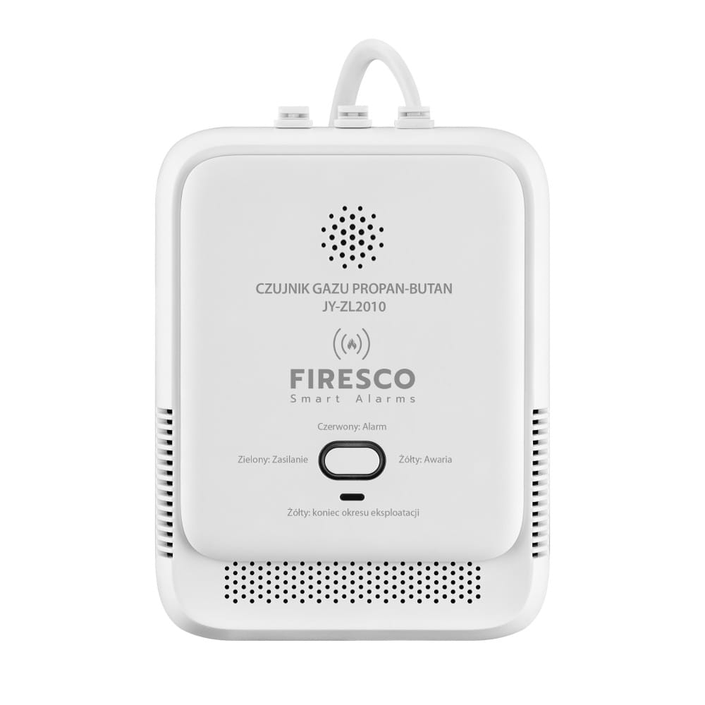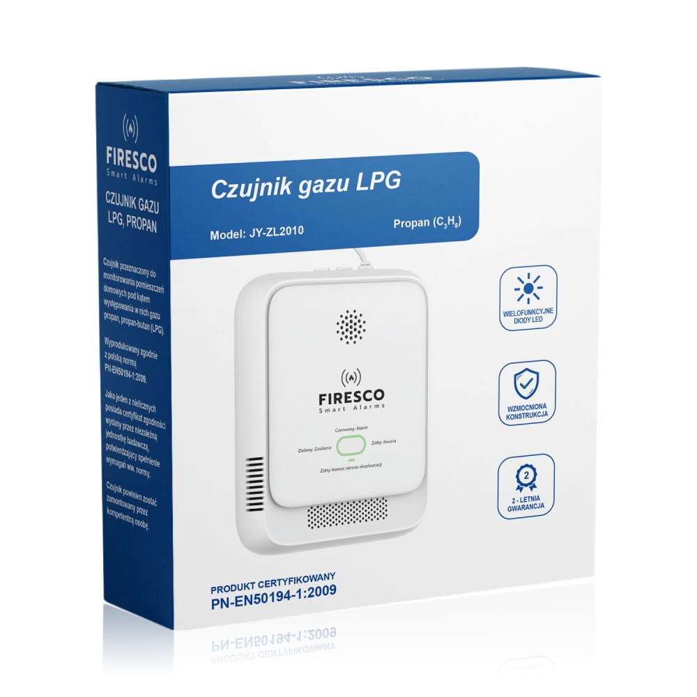 Czujnik Firesco JY-ZL2010 przeznaczony jest do monitorowania pomieszczeń pod kątem występowania w nich propanu (C3H8), mieszaniny propan-butan (LPG). Bazuje na sensorze półprzewodnikowym, charakteryzującym się wysoką dokładnością oraz trwałością nawet do 5 lat. Został skalibrowany tak, aby uruchamiał sygnalizację alarmową już przy stężeniu ≤7% DGW ±3% DWG (Dolnej Granicy Wybuchowości) dla propanu. W przypadku wykrycia wycieku gazu załącza się optyczno-akustyczna sygnalizacja alarmowa. Urządzenie posiada układ autodiagnostyczny monitorujący sensor oraz wewnętrzne obwody. W przypadku nieprawidłowej pracy zapala się żółta dioda LED informująca o wykryciu usterki. Zasilany jest napięciem 220-240V AC 50/60Hz za pośrednictwem kabla o długości 150 cm, zakończonego wtykiem europejskim typu C. Czujnik JY-ZL2010 jest przeznaczony do montażu na wewnętrznych ścianach budynku, w pomieszczeniach, w których temperatura nie spada poniżej 0°C oraz nie wzrasta powyżej +55°C oraz wilgotność nie przekracza 95% RH.