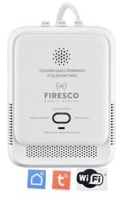 Czujnik Firesco JT-ZL2010W przeznaczony do monitorowania pomieszczeń pod kątem występowania w nich gazu ziemnego (LNG, metan CH4). Bazuje na sensorze półprzewodnikowym, charakteryzującym się wysoką dokładnością oraz trwałością nawet do 5 lat. Posiada moduł łączności WiFi umożliwiający połączenie z siecią Tuya / Smart Life. Może być używany, również jako samodzielna jednostka, bez konieczności połączenia z aplikacją. W przypadku podłączenia do domowej sieci czujnik prześle komunikaty alarmowe oraz wszelkie inne monity do aplikacji użytkownika w czasie rzeczywistym. Sygnalizacja optyczno-akustyczna załącza się już przy stężeniu ≤7%DGW ±3%DWG (Dolnej Granicy Wybuchowości) dla metanu. Czujnik posiada układ autodiagnostyczny monitorujący sensor oraz wewnętrzne obwody. W przypadku usterki zapala się żółta dioda LED. Zasilany jest napięciem 220-240V AC 50/60Hz za pośrednictwem kabla o długości 150 cm, z wtykiem europejskim typu C. Czujnik JT-ZL2010W został przeznaczony do montażu na wewnętrznych ścianach budynku, w pomieszczeniach, w których temperatura mieści się w zakresie 0 ~ 55°C, a wilgotność względna nie przekracza 95%.