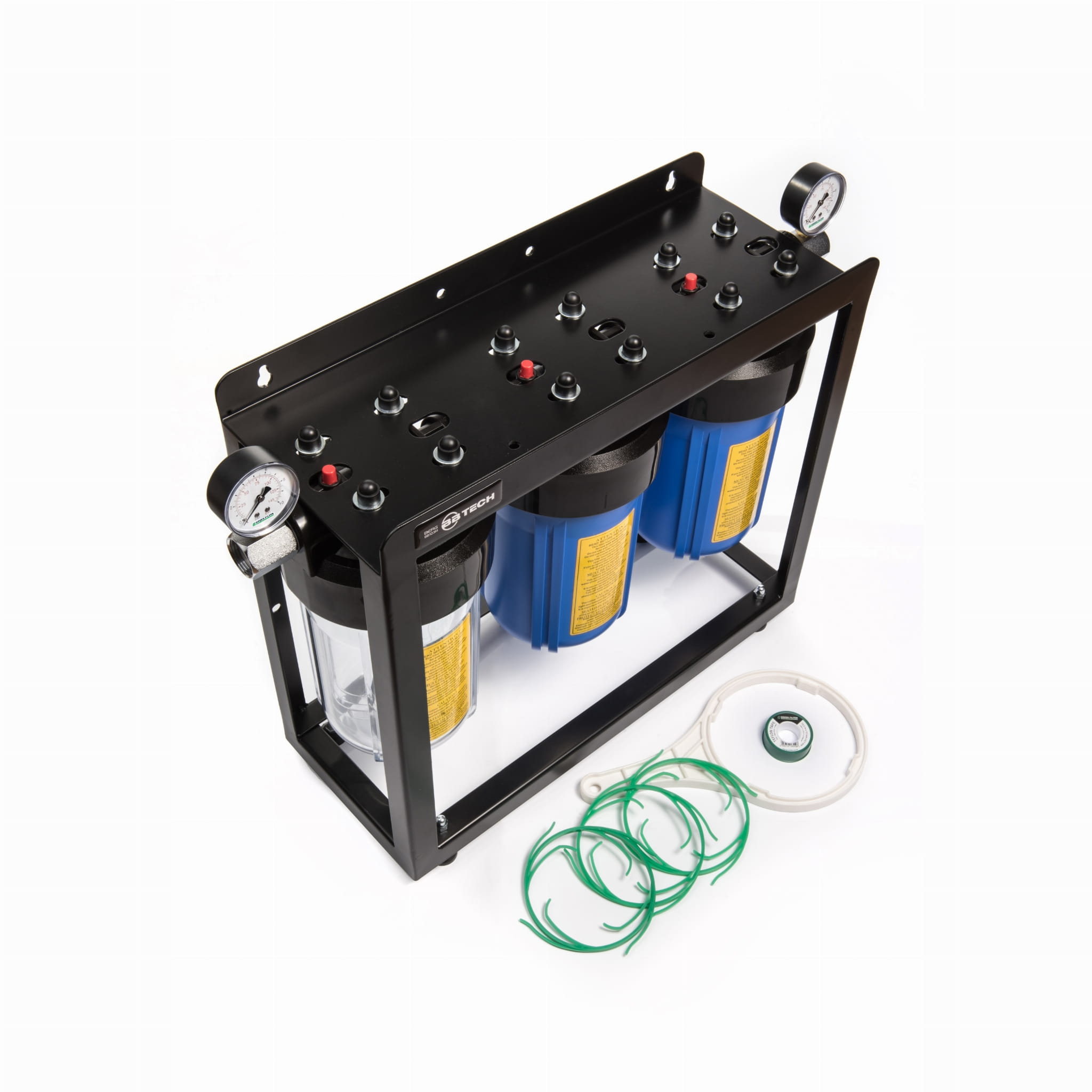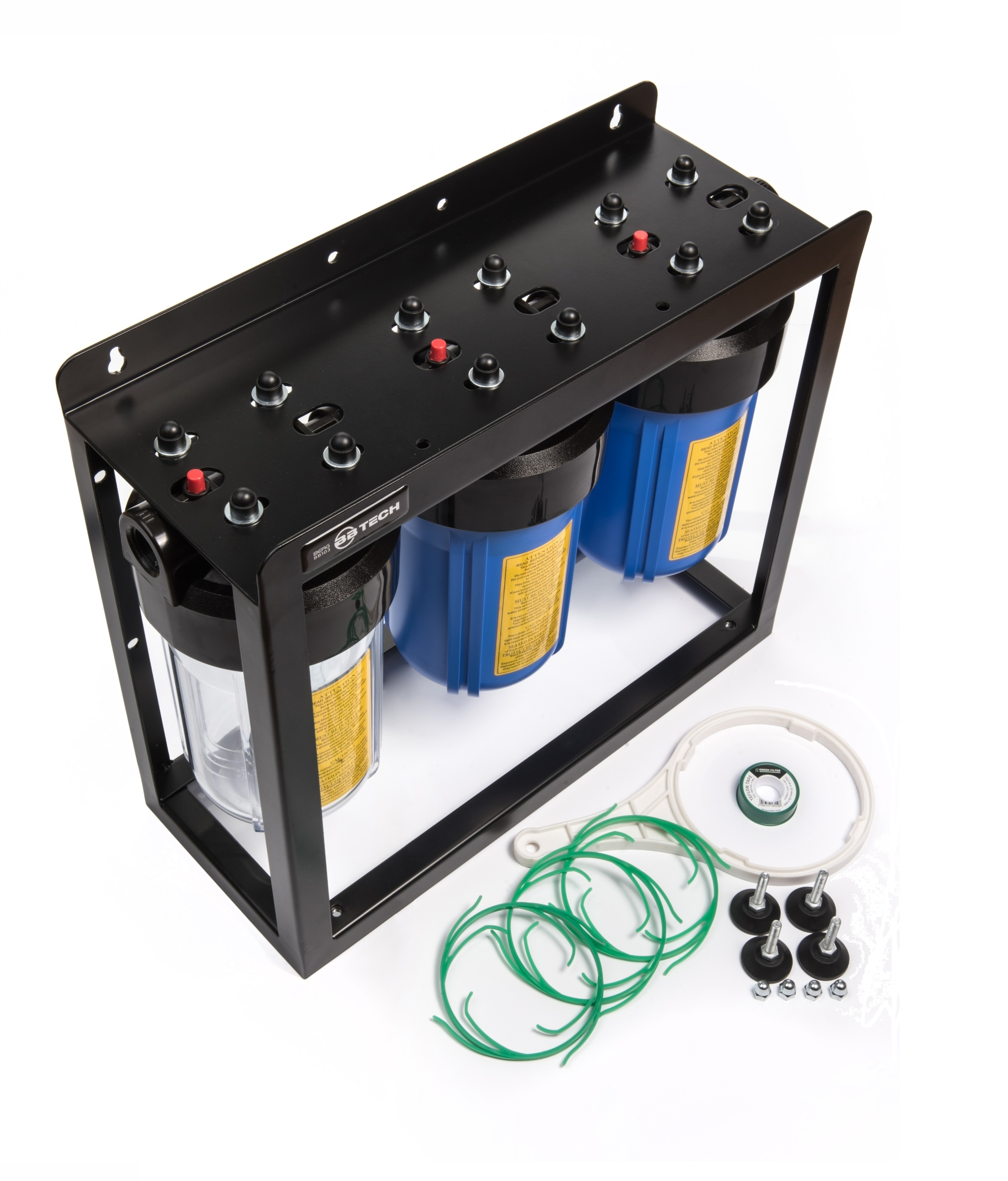 Komplet do filtracji wody na cały dom lub firmę, przeznaczony do wkładów typu Big Blue (4,5" x 10"), które są dostępne na innych naszych aukcjach. Produkt umożliwia instalację dowolnej konfiguracji wkładów, np. mechanicznych, węglowych, odżelaziających lub zmiękczających w zależności od indywidualnych potrzeb klienta. Stelaż urządzenia został wyprodukowany w Polsce z najwyższej jakości surowca. Korpusy Big Blue są odporne na skoki ciśnienia w instalacjach oraz posiadają zabezpieczenie w postaci podwójnego oringu.