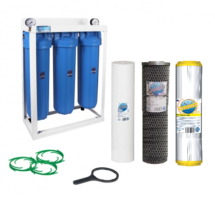 Zesstaw 3-korpusów 20" typu BIG BLUE HHBB20B z kloszami w kolorze niebieskim (chronią wkłady przed zjawiskiem fotosyntezy, w przypadku gdy filtr zainstalowany jest w nasłonecznionym miejscu). Korpusy wyposażone są z zawór odpowietrzający, który umożliwia uwolnienie powietrza zalegającego w filtrze po wymianie wkładu (odpowietrzenie wkładu). Dodatkowo korpusy posiadają innowacyjny typ klosza (dno bardziej okrągłe) co w znacznym stopniu zwiększa odporność na rozrywanie. Ciśnieniomierze kontrolują stan zużycia wkładów filtrujących, oraz informują o aktualnym ciśnieniu w instalacji. Wysoka wydajność urządzenia umożliwia montaż systemu w instalacjach przemysłowych oraz w miejscach o zwiększonym zapotrzebowaniu na wodę. W zależności od jakości wody system można dowolnie konfigurować za pomocą wkładów: mechanicznych, węglowych oraz specjalistycznych typu Big Blue 20". Systemu nie należy używać do wody zanieczyszczonej mikrobiologicznie oraz nieznanego pochodzenia. Urządzenie kompatybilne jest z większością wkładów 20" typu Big Blue dostępnych na rynku.