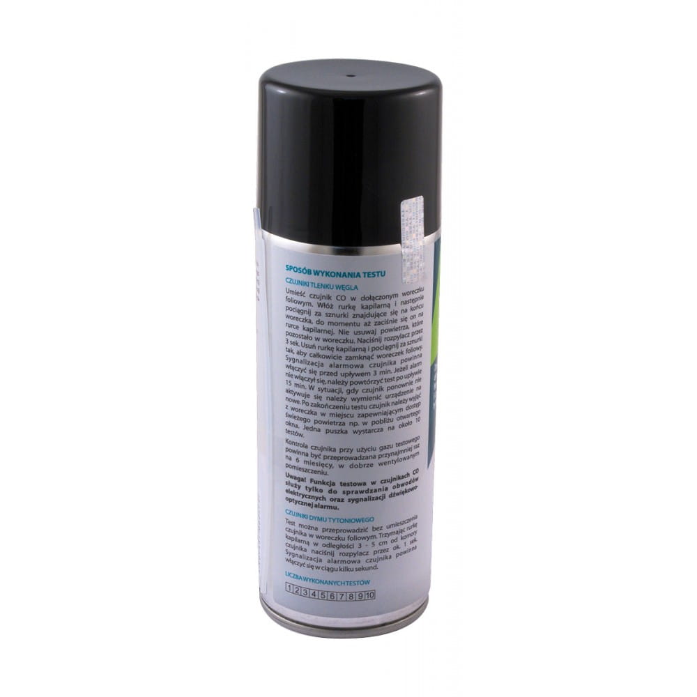 Czas wykonania próby ok. 2-3 minuty – czujniki czadu oraz poniżej 1 minuty – czujniki dymu tytoniowego. Jedna puszka o pojemności 400ml wystarcza na około 10 testów.