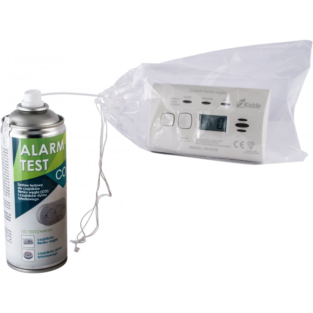 Zestaw przeznaczony do testowania czujników tlenku węgla i czujników dymu tytoniowego. W jego skład wchodzą puszka gazu testowego, rurka kapilarna oraz woreczek strunowy.