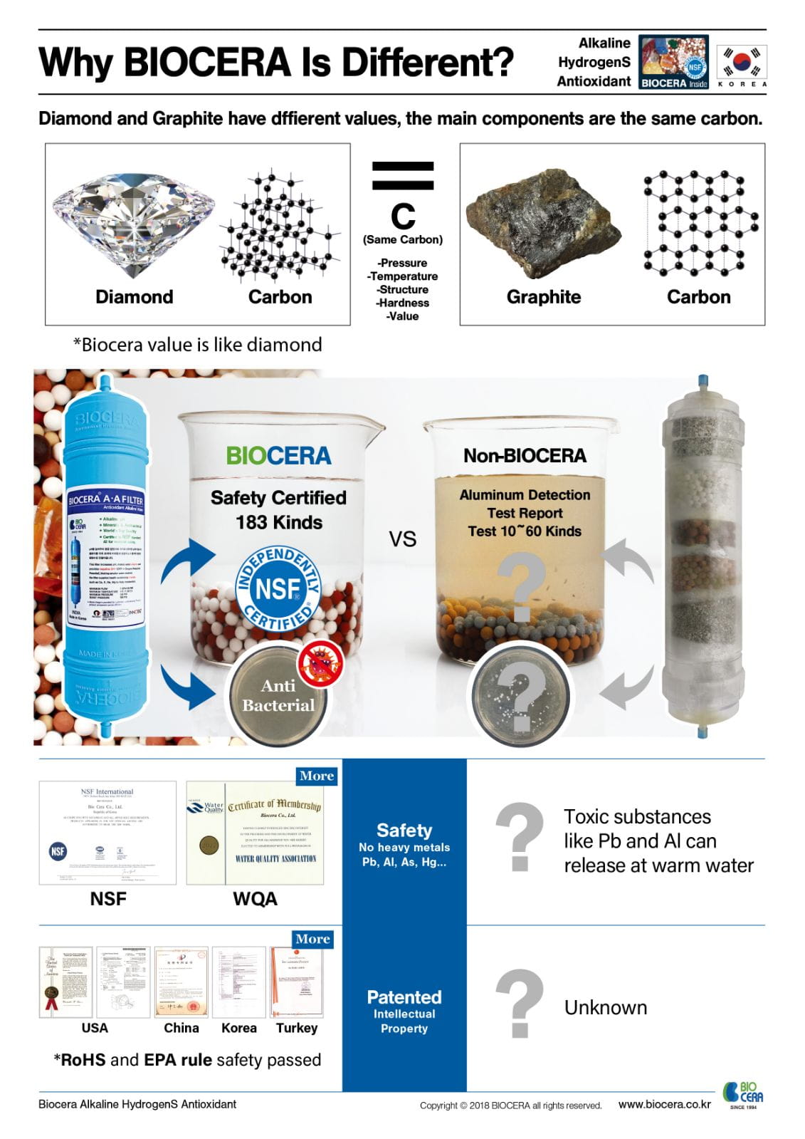 Opatentowana technologia firmy Biocera z Korei Południowej. Wkład Biocera Antioxidant Alkaline - redukuje ORP wody (max do wartości - 600 mV), podnosi pH (od ok. 9,5) - zależnie od jakości wody oraz prędkości przepływu. Jedyny na rynku wkład tego typu produkujący wodę antyoksydacyjną natychmiast o tak wysokich parametrach, nawet z wody osmotycznej.