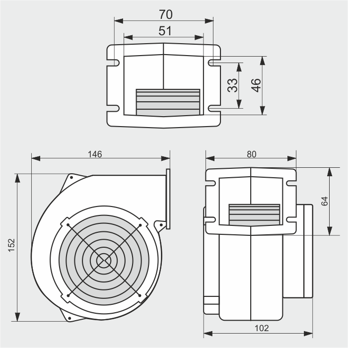 Wentylator składa się z dwóch części obudowy aluminiowej, w której zamocowany jest silnik z zewnętrznym wirnikiem. Otwór wlotowy zabezpieczony jest siatką. Otwór wylotowy zakończony jest kołnierzem z otworami do mocowania.