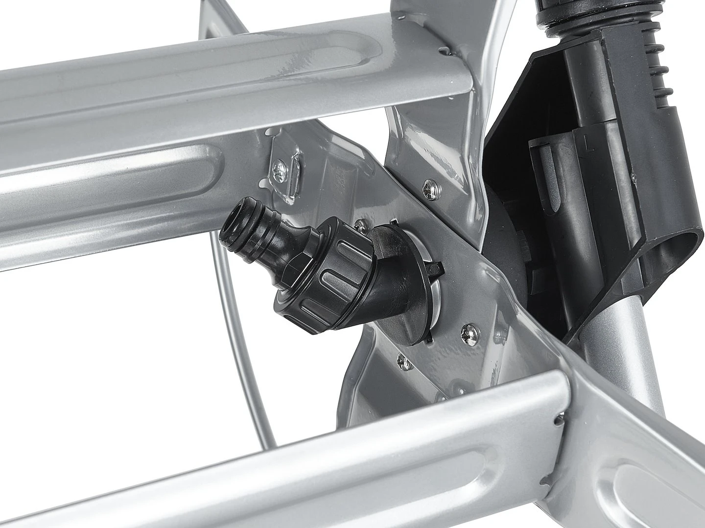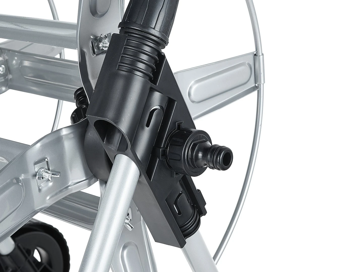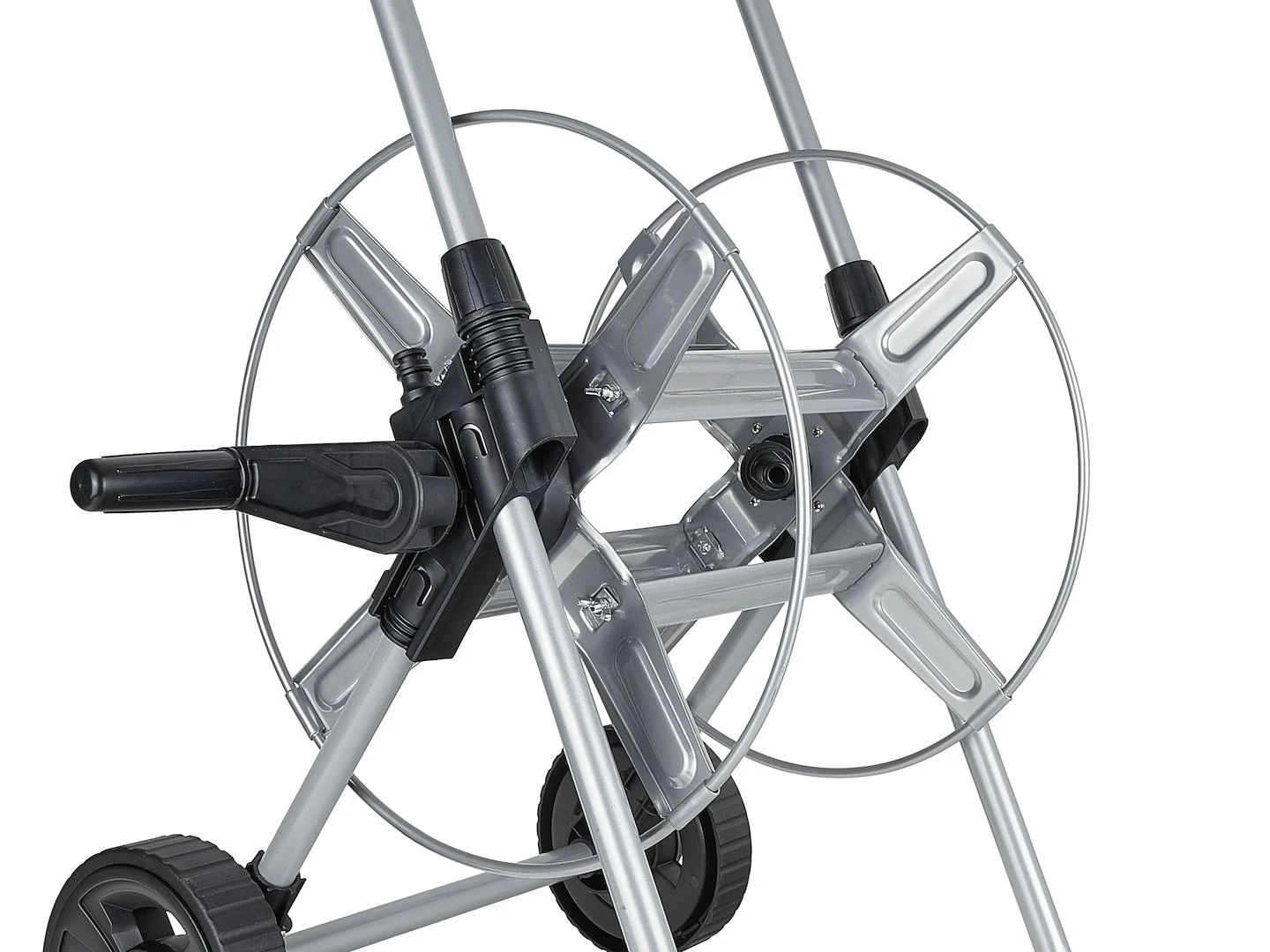 - Stabilna podstawa – wózek pewnie stoi podczas rozwijania i zwijania węża.