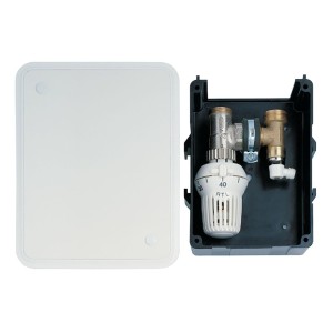 Zestaw do ogrzewania podłogowego T6102AUB15 montowany w estetycznej skrzynce z frontem metalowym, lakierowanym proszkowo wykonany z głowicą wewnątrz. Zestaw składa się z głowicy RTL, zaworu termostatycznego z wkładką UBG o zwiększonym przepływie i odpowietrznika. Zestaw montowany jest na powrocie pętli ogrzewania podłogowego. Zakres regulacji głowicy zapewnia właściwą temperaturę czynnika grzewczego podczas przepływu przez pętlę.