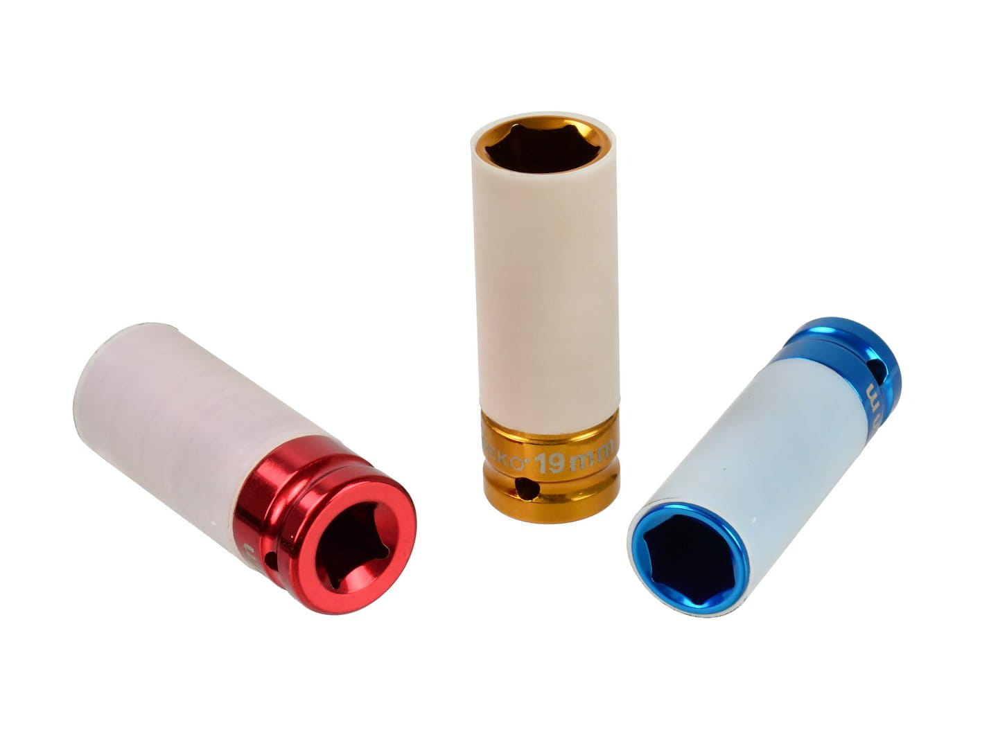 Zestaw profesjonalnych długich nasadek udarowych do alufelg charakteryzujących się bardzo wysoką odpornością na zrywanie i uszkodzenia mechaniczne. Każda z nich posiada osłonę z tworzywa sztucznego, która chroni alufelgę przed zarysowaniami.