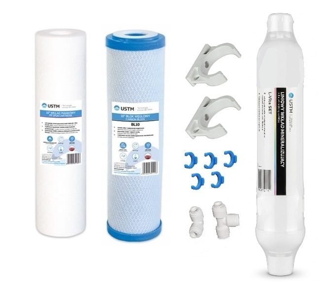 Półroczny komplet wkładów do osmozy SILVER marki USTM. Zestaw składa się z wkładu piankowego, bloku węglowego oraz wkładu liniowego mineralizującego.